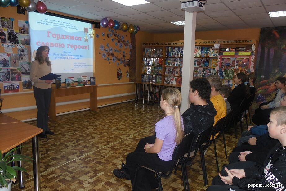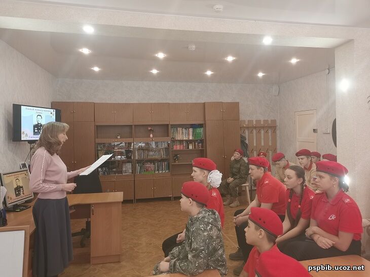 В начале декабря Поспелихинская детская модельная библиотека провела цикл мероприятий, посвященный Дню Героев Отечества. 9 декабря в День Героев Отечества для членов клуба «Воспитай себя достойно!» (учащиеся 5 «А» класса школы № 1) прошла беседа «Гордимся славою героев!». Ребята узнали, что этот праздник – дань высочайшего государственного и общественного уважения к тем, кто удостоен самых почетных государственных наград – званий Героев Советского Союза, Российской Федерации, орденов Славы и Святого Георгия. Из видеосюжета ребята узнали об истории возникновения праздника, о том, что «Золотой Звездой» Героя награждаются не только взрослые, но и дети, и подростки, совершившие героический подвиг. Ребята вспомнили героев Поспелихинского района, узнали, что некоторым участникам СВО присвоено звание Героя РФ. Среди поспелихинцев, принимающих участие в специальной военной операции на Украине нет тех, кому присвоено звание Героя России. Но некоторые из них награждены Орденом мужества. Так, например, Ильинский Сергей Михайлович участник СВО, погибший при выполнении воинского долга был награжден таким орденом. 11 декабря Поспелихинская детская модельная библиотека работала на Образовательной площадке «Книжный десант «Гордимся славою героев»» в рамках IV муниципального слета юнармейцев Поспелихинского района. Ребята вспомнили Героев Поспелихинского района – Фролова Михаила Павловича, Гончарова Ивана Ивановича, Зубареав Михаила Степановича, Кузнецова Ивана Лазаревича, Попова Василия Андреевича, Рукина Игната Трофимовича и посмотрели видеосюжет об открытии памятной доски Фролову Михаилу Павловичу. Герои Отечества – это не только люди, совершившие подвиг в прошлом, есть и герои, живущие в наше время. Из видеосюжета ребята узнали об одном из участников СВО, которому было присвоено звание Героя Российской Федерации. Из мероприятия дети узнали, что звания Герой Российской Федерации или Герой Советского Союза удостаиваются не только участники боевых действий, но и люди мирных профессий. Ребята посмотрели видеосюжет о Герое Советского Союза и Герое Российской Федерации учёном-океанологе Артуре Чилингарове. В завершении встречи ребятам были предложены к прочтению книги о героях мирных профессий, Великой Отечественной войны и СВО, имеющиеся в фонде детской библиотеки. Мероприятия посетили 46 человек.