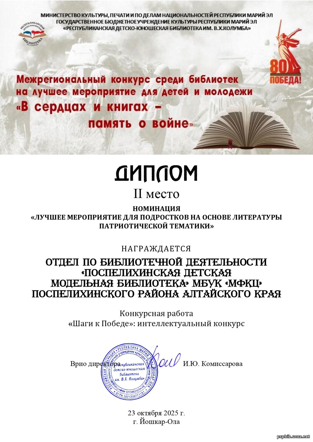 23 октября ГБУК Республики Марий Эл «Республиканская детско-юношеская библиотека им. В.Х.Колумба» подвела итоги межрегионального конкурса среди библиотек на лучшее мероприятие для детей и молодёжи «В сердцах и книгах – память о войне», посвящённого 80-летию Победы в Великой Отечественной войне. Конкурс, проводимый в Год защитника Отечества, был направлен на выявление и продвижение лучших библиотечных практик по организации и проведению мероприятий, посвящённых мужеству и героизму защитников Отечества в период Великой Отечественной войны 1941–1945 гг. и в ходе специальной военной операции. Участие в конкурсе приняли государственные и муниципальные библиотеки, библиотеки образовательных учреждений Республики Марий Эл, Республики Татарстан, Республики Башкортостан, Алтайского и Красноярского краёв, Архангельской, Кемеровской, Московской, Мурманской, Нижегородской, Ростовской, Рязанской, Саратовской, Свердловской, Тюменской, Челябинской областей, городов Санкт-Петербурга, Новосибирска, Пскова, Иваново и Вологды. Всего на конкурс поступило 67 творческих работ, включающих сценарий и описание опыта проведения мероприятия, направленного на приобщение детей и молодёжи к чтению литературы, тематика которой связана с историей Великой Отечественной войны и/или событиями специальной военной операции. Поспелихинская детская модельная библиотека заняла 2 место в номинации «Лучшее мероприятие для подростков на основе литературы патриотической тематики». | |