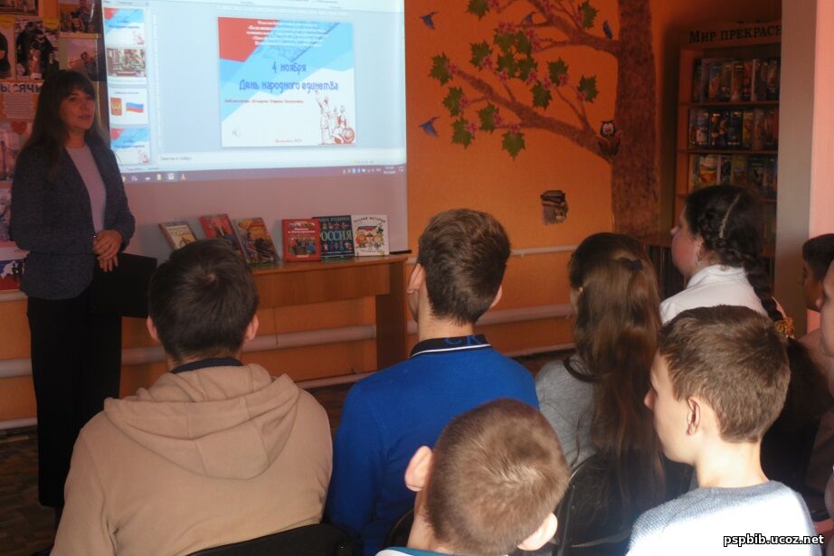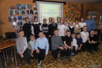 С 5 по 7 ноября в Поспелихинской детской модельной библиотеке прошёл познавательный час «Россия - это мы!», посвящённый Дню народного единства. Мероприятие посетили ребята из 4Б, 5Б, 7А и 7Б классов ПСОШ № 1. Библиотекарь рассказал детям о событии, в честь которого 4 ноября был объявлен государственный праздник День народного единства. Более 400 лет назад столицу нашей Родины – Москву захватили поляки. На защиту Москвы и всей России поднялся народ, объединились все сословия, национальности, деревни и города – это было поистине народное ополчение, а возглавили его Кузьма Минин и Дмитрий Пожарский. Освободив Москву, Россия показала всему миру героизм и сплочённость всего нашего народа! Также ребята совершили небольшое путешествие по разным республикам нашей страны и посмотрели символы, национальные костюмы, послушали музыку разных народностей и узнали немного нового. В завершении мероприятия дети пропели Гимн России вместе с жителями нашей необъятной Родины! Мероприятие посетили 112 человек. | |
