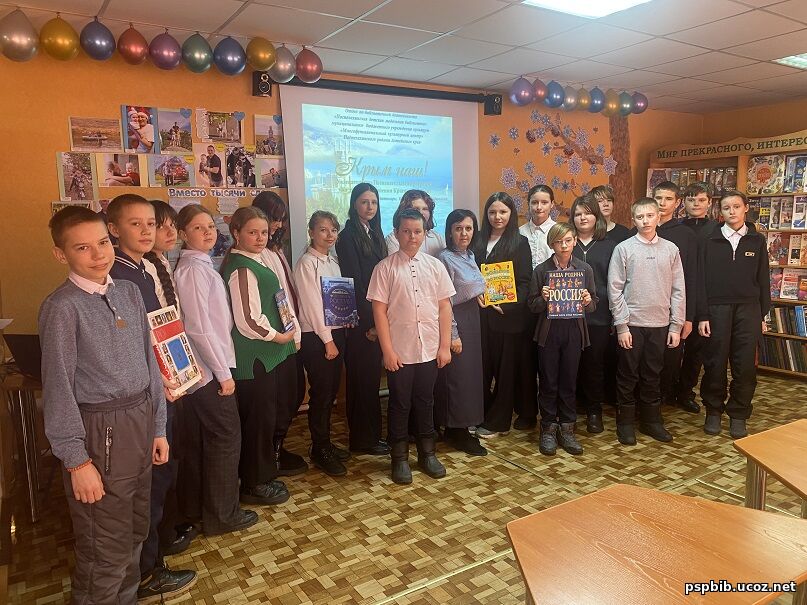 18 марта в Поспелихинской детской модельной библиотеке прошла увлекательно-познавательная программа «Путешествие по Крыму» ко Дню воссоединения Крыма с Россией. Участниками мероприятия стали ребята из 6 «А» класса. Возвращение крымских территорий в состав России было зафиксировано межгосударственным договором, подписанным как раз 18 марта 2014 года в Георгиевском зале Большого Кремлевского дворца в Москве главами России и Республики Крым. Библиотекарь познакомила ребята с историей Крымского полуострова, с его географическими и экономическим положением, а также с природным миром и достопримечательностями. «Медведь-гора», Международный детский лагерь «Артек», Долина приведений, «Херсонес Таврический», Тропа Голицына, Воронцовский и Ливадийский дворцы, «Ласточкино гнездо», Озеро «Сасык-Сиваш» – это лишь малая часть красот и чудес Крымского полуострова. Они такие разные – уникальные уголки природы, живописные парки, горные пейзажи, роскошные дворцы, исторические памятники. Крым - край удивительной красоты, не оставляющий равнодушным никого, кто побывал на этой приветливой земле. В завершении патриотической программы ребята спели гимн Российской Федерации. Мероприятие посетили 23 человека. | |